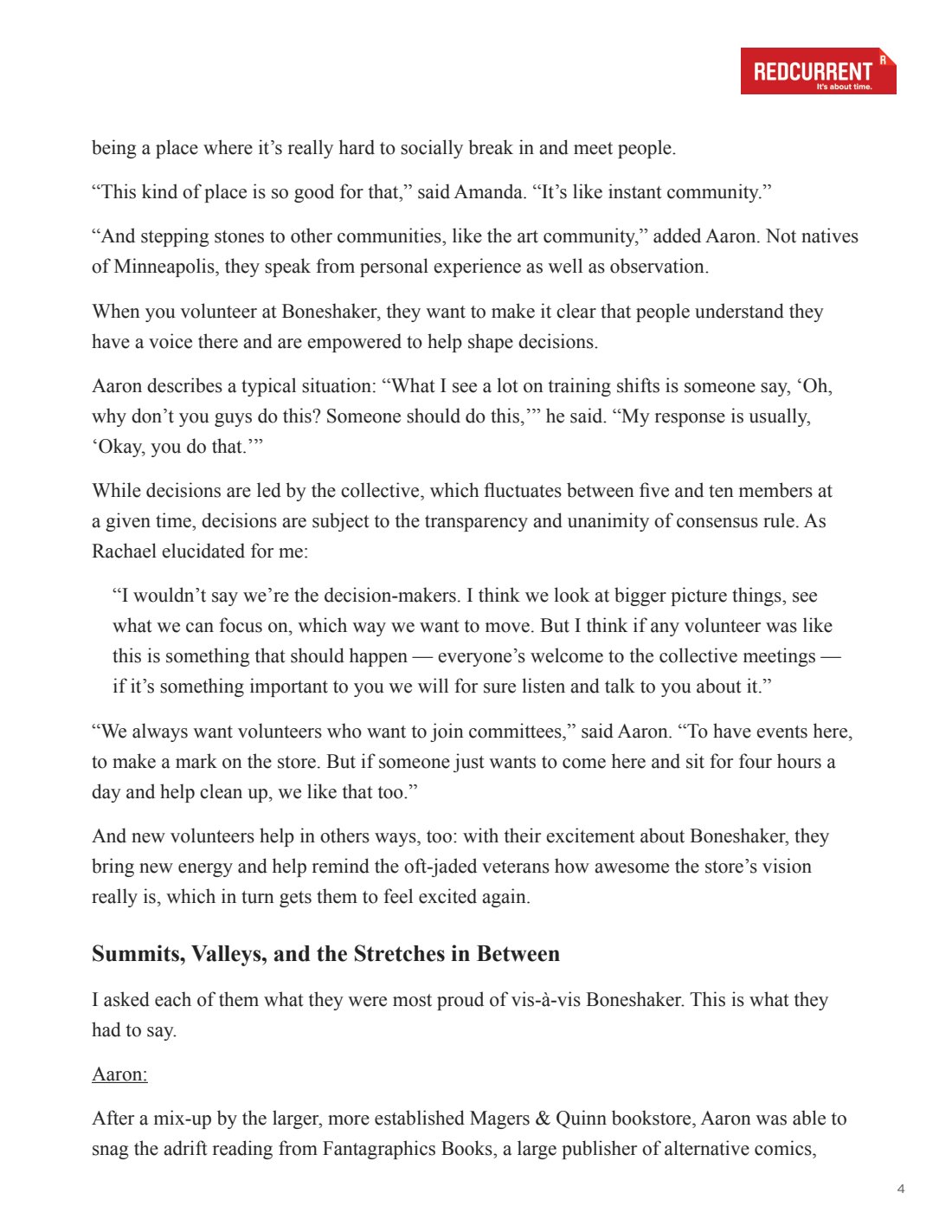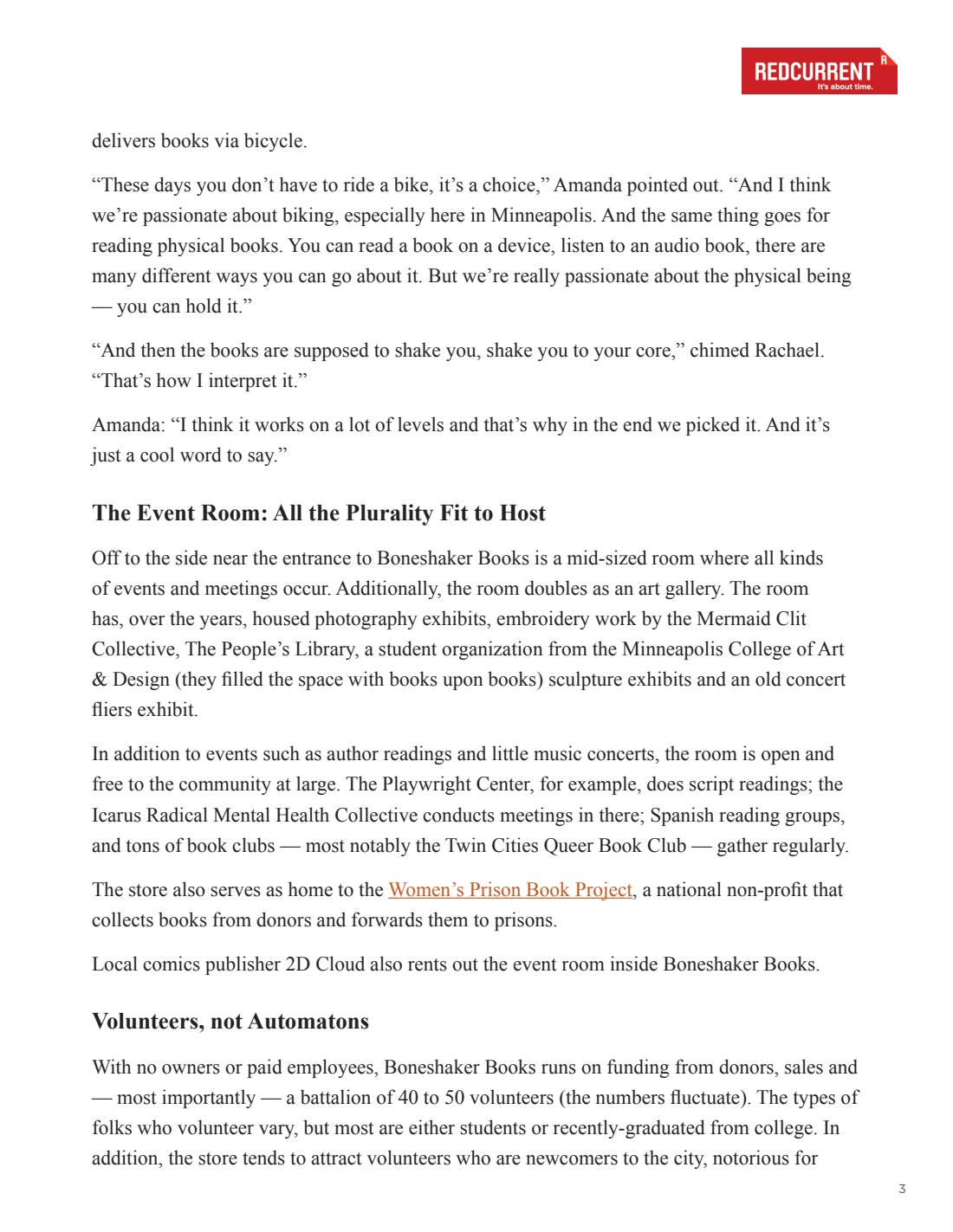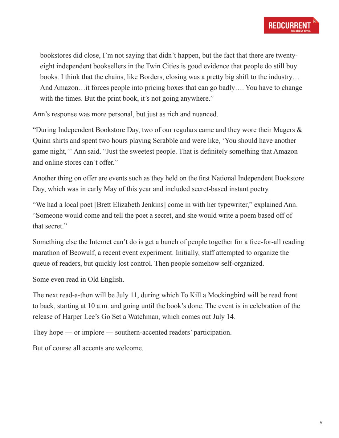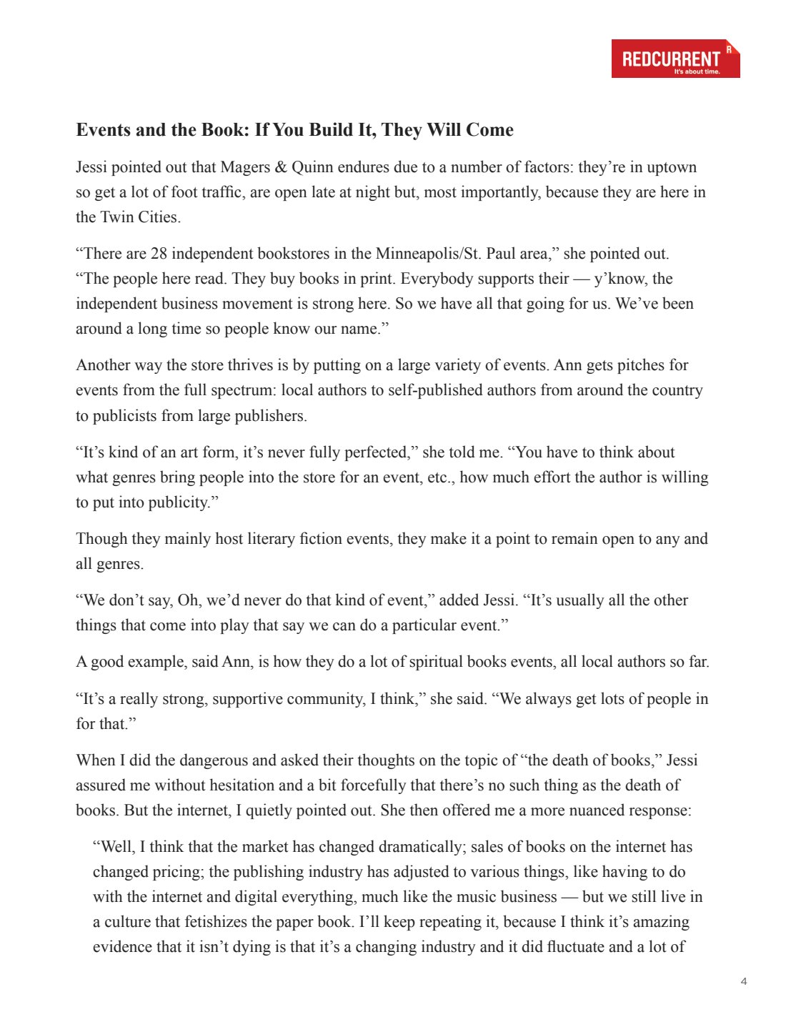 RedCurrent (now defunct) was a tech start-up based on an app to help busy people (mainly parents of young children) to easily and effectively find events and activities. I was a contributing writer for the business's blog, which started with showcasing events in the Twin Cities, with the plan to expand to other cities. As with the majority of startups, the company didn't take off. The silver lining is that there was great interest in the blog, since people are generally interested in learning about the interesting things happening locally. But demand for the main product, the app, did not materialize.