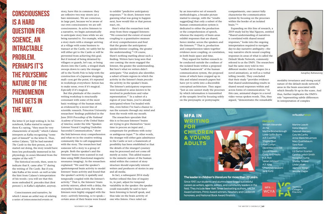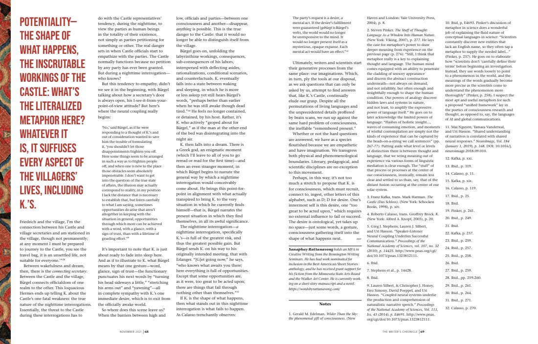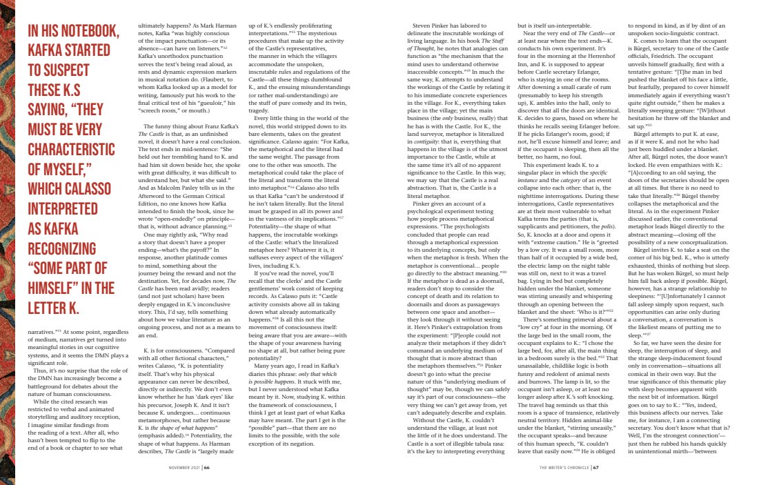 Published in the November 2021 issue of The Writer's Chronicle, the flagship publication of the Association of Writers and Writing Programs, this essay explores the connections between leading theories of consciousness, literary criticism, fiction (in this case, Franz Kafka's unfinished novel, The Castle), language theory, and recent neuroscience research into how we process stories and construct narrative models.