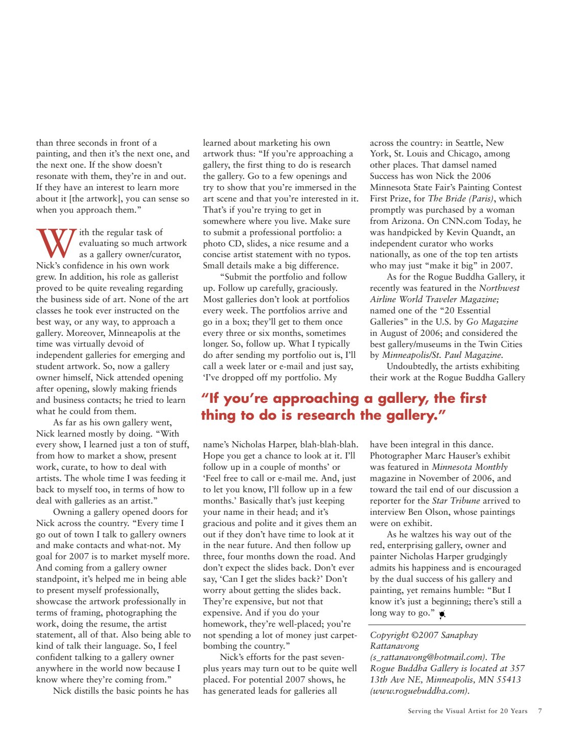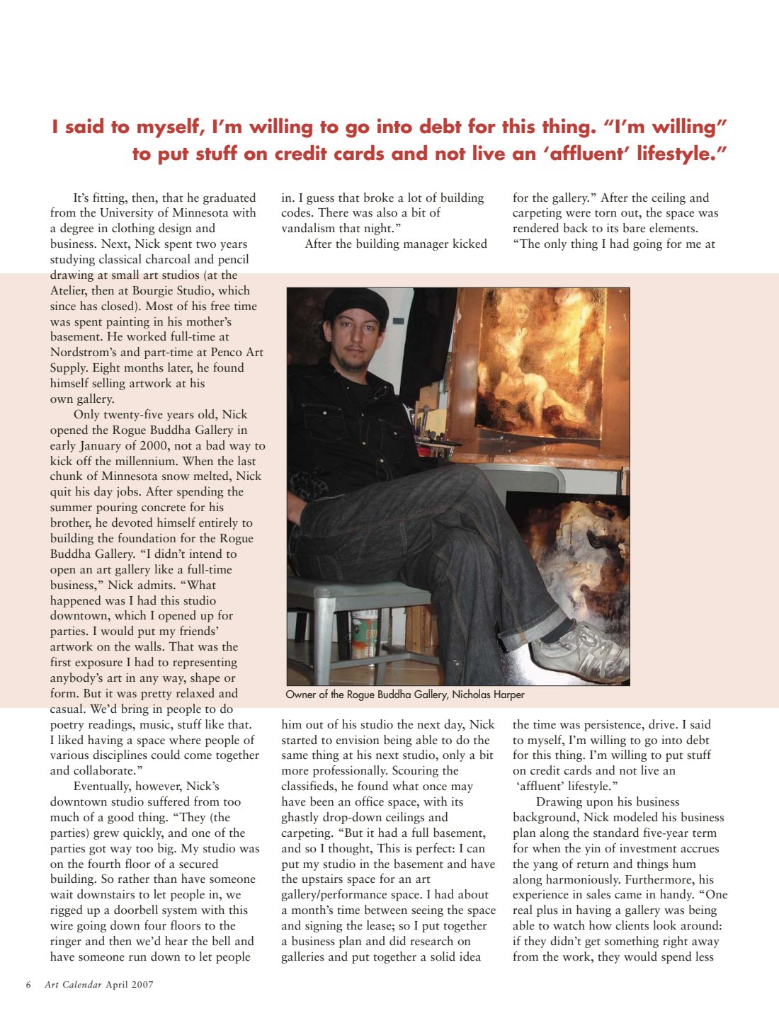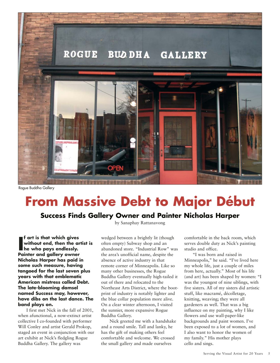 Feature article published in Art Calendar (now Professional Artist), the foremost business magazine for visual artists, covering the business side of arts about successful small art gallery. Describes the background and history of a painter and gallery owner named Nicholas Harper. It tells of his struggles with debt and the journey of his gallery, the Rogue Buddha Gallery, which he opened in 2000. The text also mentions the influence of his family and his interest in painting women and using flowery backgrounds. It also mentions that the gallery was originally located in an area of Minneapolis called "Industrial Row" but has since moved to a district where the "bootprint of industry is notably lighter." The text concludes by describing how Nick's downtown studio was shut down due to too many parties and vandalism, leading him to find a new space for the gallery.